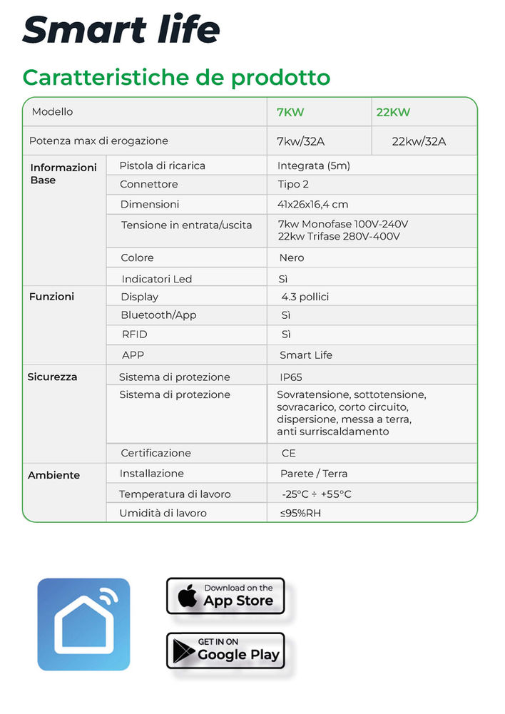 Smart life, con il suo sistema di ricarica plug&charge, è la stazione di ricari- ca ideale per casa tua. Semplice da usare e ricca di funzioni. Scegli la po- tenza più adatta a te e gestisci la ricarica tramite app Smart life.